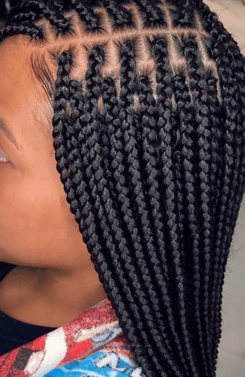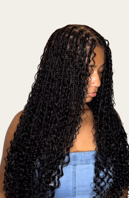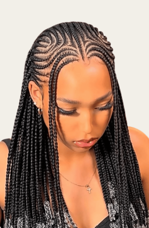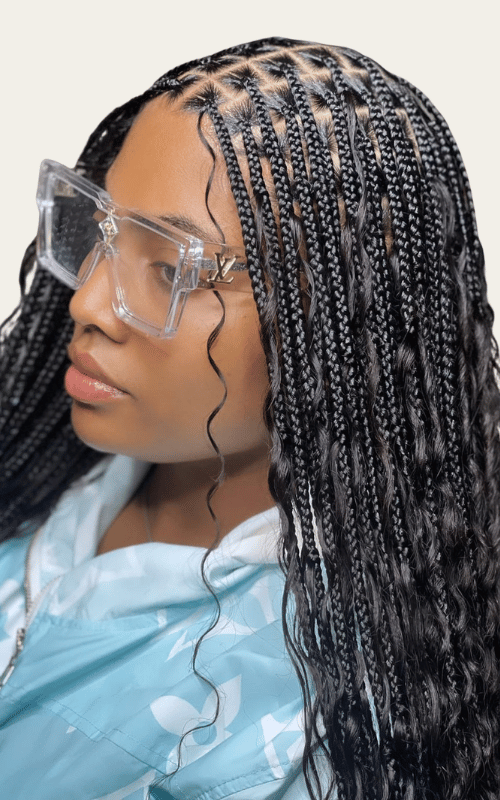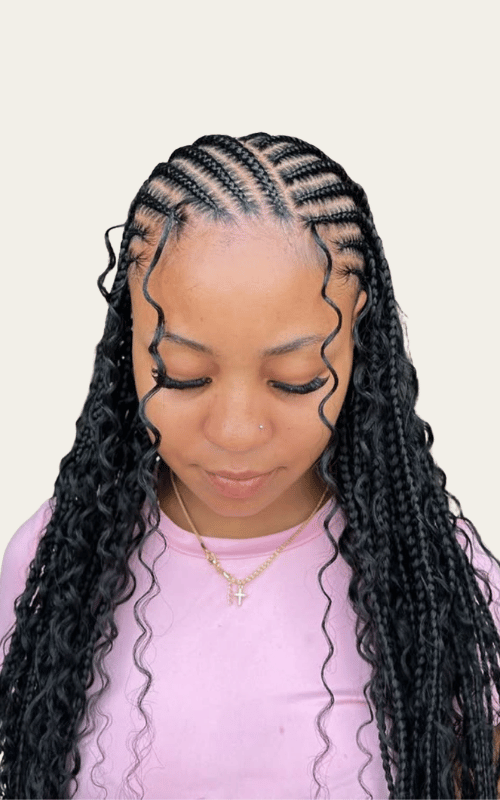 A mix of cornrows and individual braids that can be styled in many patterns. You can choose your size, length, and add curls or accessories